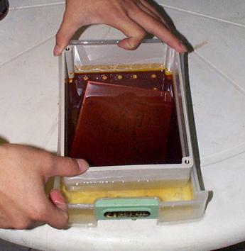 將三氯化鐵按3:5的比例開成溶液,將我們已用酸性記號筆畫好電路的要制作的電路板,放在一個塑料的盤子當中進行泡處理,不過,最好的辦法還是讓溶液不斷的流過電路板上的銅面上,不過辦法的話,直接泡就是了。
