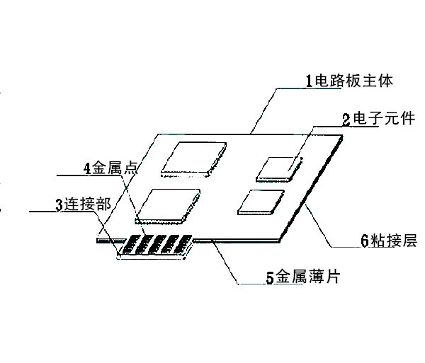 作為優(yōu)選,所述電路板主體、電子元件、連接部、加強(qiáng)板、金屬薄片及金屬點表面均設(shè)有抗氧化層。